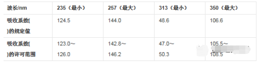 取在120℃干燥至恒重的基準重鉻酸鉀約60mg,精密稱定,用0.005mol/L硫酸溶液溶解并稀釋至1000ml,在規定的波長處測定并計算其吸收系數,并與規定的吸收系數比較: