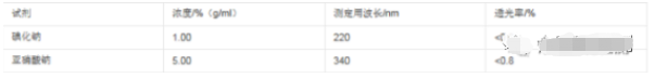 雜散光的檢查:可按下表所列的試劑和濃度,配制成水溶液,置1cm石英吸收池中,在規定的波長處測定透光率,應符合表中的規定。