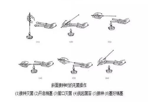 ④再將兩個試管口在火焰上灼燒。將灼燒過的接種環伸入接種管內。使接種環在試管內壁上冷卻,然后用接種環在菌苔上刮取少許后抽出,抽出時勿與試管壁相碰,也不要通過火焰。