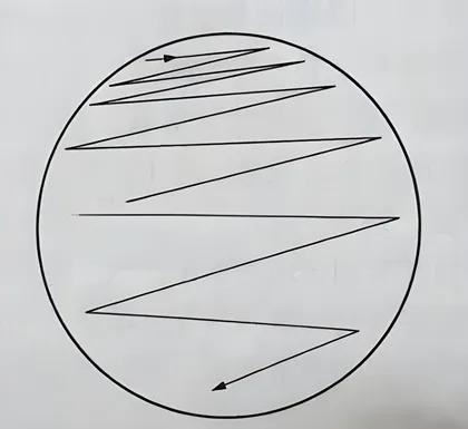 1、 左手拿培養皿,右手持接種環,打開蓋子一條縫隙,將沾菌接種環在平皿邊緣“之”字劃第一區域(約 1/4~1/5 面積)。