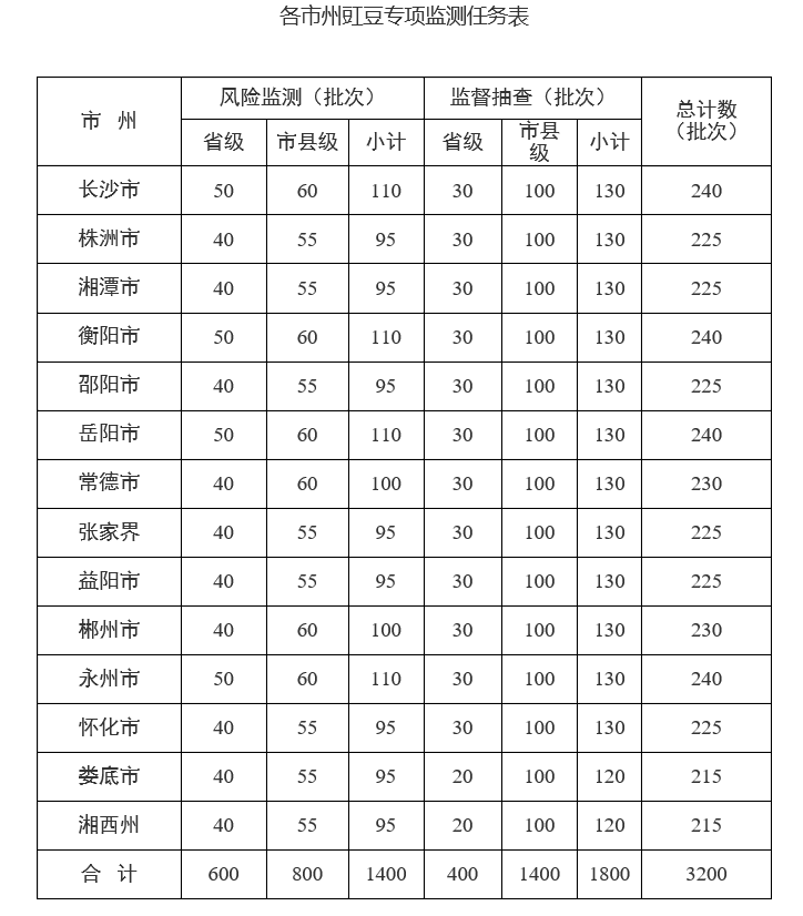 豇豆專項監督抽查納入2023年度監督抽查計劃,抽樣任務由各市縣農業行政主管部門承擔,檢測任務委托廣電計量檢測(湖南)有限公司承擔。在5月至10月監督抽查豇豆400批次,每月針對各市州以商品生產為目的的豇豆種植戶,抽取確定上市的產品,同一種植戶抽取樣品數量不超過2個,抽取樣品20批次至30批次。監測結果作為執法查處的依據。