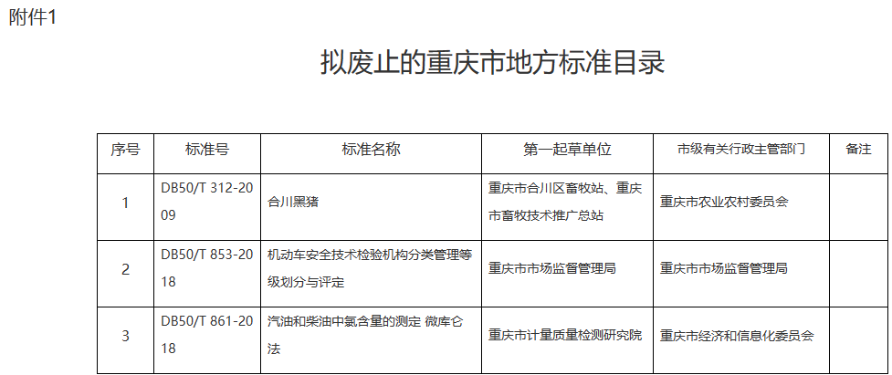 為進一步加強地方標準管理,提高地方標準的質量水平,根據《中華人民共和國標準化法》《重慶市標準化條例》和《重慶市地方標準管理辦法》(市人民政府令第317號)的有關規定,經征集市級有關行政主管部門和第一起草單位的地方標準復審意見,決定對DB50/T 861-2018《汽油和柴油中氯含量的測定 微庫侖法》等3項重慶市地方標準(見附件1)進行廢止前社會公示。請全市各相關行業、領域認真研究,若有不同意見的請于公示期內將意見表(見附件2)書面反饋至市市場監管局標準化處。公示截止時間為2023年11月17日。