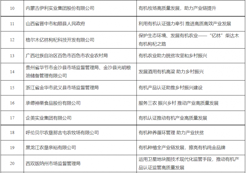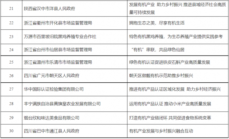 為大力推動有機產品認證實施工作,總結交流質量認證促進有機產業發展、助力鄉村產業振興和生態文明建設的創新做法和成功經驗,今年7月,市場監管總局認證監管司組織開展了“有機產品認證優良實踐案例”征集活動,共收到來自全國各相關單位的優良實踐案例127個。經中國有機產品認證技術工作組評審,選出30個有機產品認證優良實踐案例(詳見附件),現予公布。請各單位積極引導借鑒學習優良案例,形成更多可復制可推廣的經驗和做法。入選案例將在“中國有機產品認證與有機產業發展技術服務平臺”(http://www.cn-organic.org.cn)對外發布。