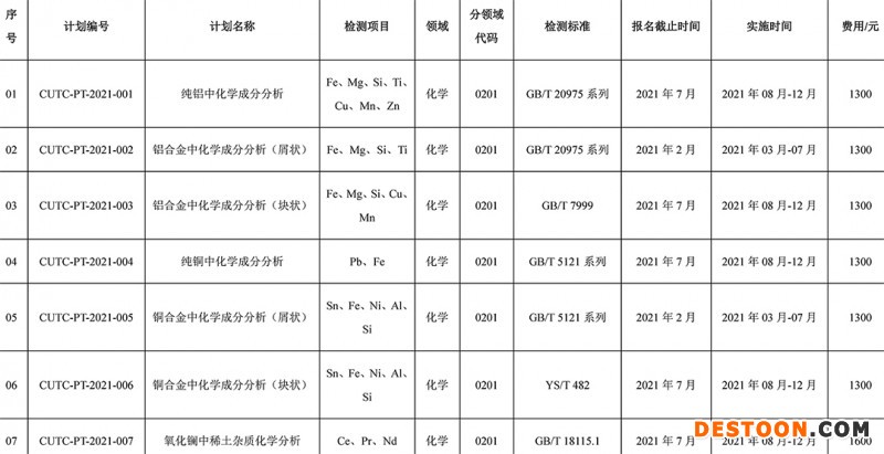 隨著我國疫情防控工作的高效開展,有色金屬企業(yè)復(fù)工復(fù)產(chǎn)已取得積極進展。為深入貫徹落實黨中央、國務(wù)院、北京市一手抓疫情防控、一手抓經(jīng)濟發(fā)展的統(tǒng)一部署,推動有色金屬行業(yè)高質(zhì)量發(fā)展,確保檢測標準量值統(tǒng)一、準確、可靠,幫助企業(yè)提高產(chǎn)品市場競爭能力,國家新材料測試評價平臺主中心、有色金屬材料行業(yè)中心、國家有色金屬質(zhì)量監(jiān)督檢驗中心、中國新材料測試評價聯(lián)盟、國合通測啟動41項能力驗證計劃,詳見附表。